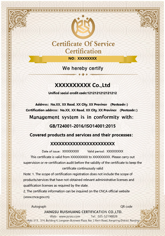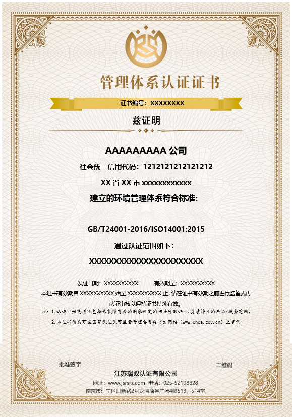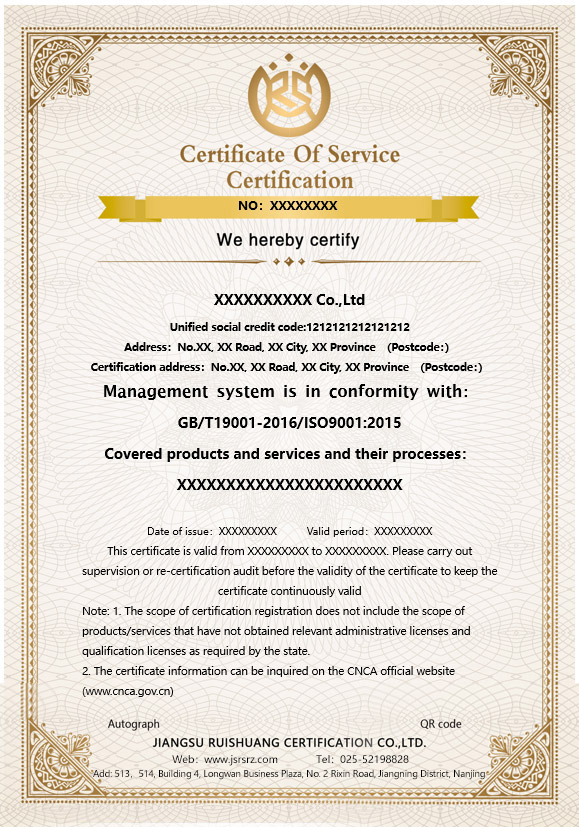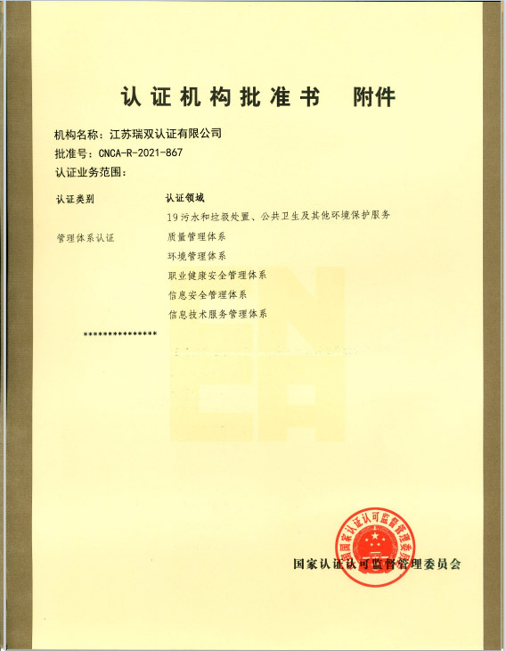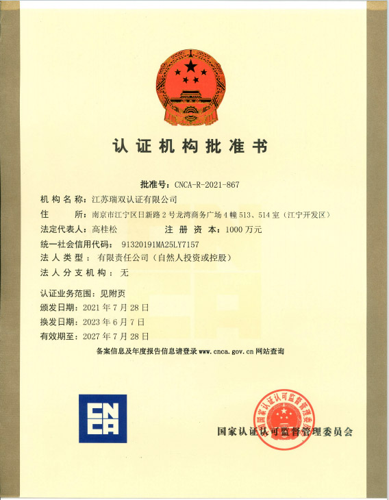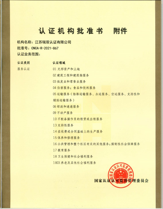 江蘇瑞雙認(rèn)證有限公司(簡稱:瑞雙認(rèn)證,RSCC),座落于六朝古都南京,是經(jīng)國家認(rèn)證認(rèn)可監(jiān)督委員會批準(zhǔn)的第三方認(rèn)證機(jī)構(gòu),開展相關(guān)管理體系認(rèn)證和服務(wù)認(rèn)證。
